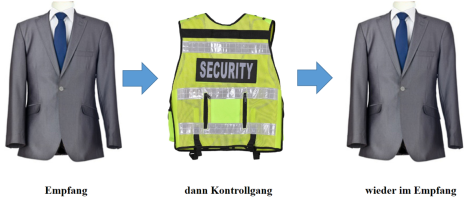 Es kann zu Unstimmigkeiten kommen, wenn das Wach- und Sicherungspersonal mehrere Aufgaben hat. Beispielsweise erfordert das Empfangen von Besuchern möglicherweise eine andere Kleiderordnung als ein anschließender Kontrollgang. Gegebenenfalls müssen entsprechende Vorkehrungen getroffen werden.